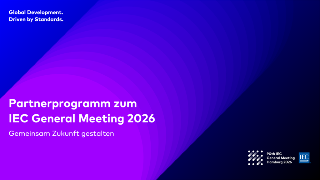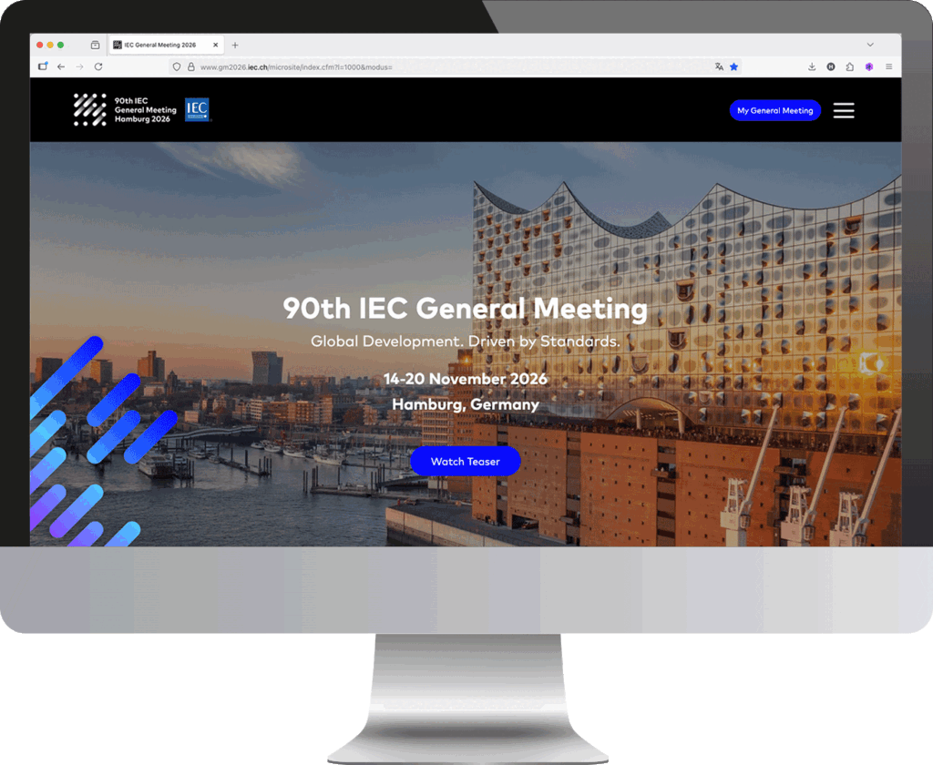 Die IEC (International Electrotechnical Commision) veranstaltet jährlich eine Zusammenkunft aller internationalen Mitglieder. Gastgeber ist im Jahr 2026 die DKE (DKE – VDE Verband der Elektrotechnik Elektronik Informationstechnik e.V.) in Hamburg. Zweck der Veranstaltung ist der Austausch und die Erarbeitung von Normen und Standards im elektrotechnischen und elektronischen Bereich. Für die Agentur 3c, die das Event vollumfänglich organisiert, durfte ich bei der Konzeption und Umsetzung des Erscheinungsbilds mitwirken. Kernelement ist das Logo. Dieses soll die Idee von Standardisierung sowie Dynamik und Austausch transportieren. Das Erscheinungsbild leitet sich in der Form- und Farbsprache davon ab und entfaltet sein volles Potential. Es funktioniert sowohl im Kontext mit dem IEC Corporate Design wie auch als herausragendes Eventdesign. Bislang wurden umgesetzt: Logo, Manual, Website, Socialmediaposts, Powerpointtemplate, Videohintergründe, Teamswallpaper … www.gm2026.iec.ch